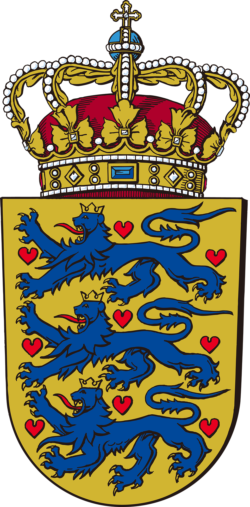 The Coat of Arms is placed in a red rectangle, associated to the Danish flag, alluding to the country the ministry represents. The blue colour of diplomacy surrounds it.